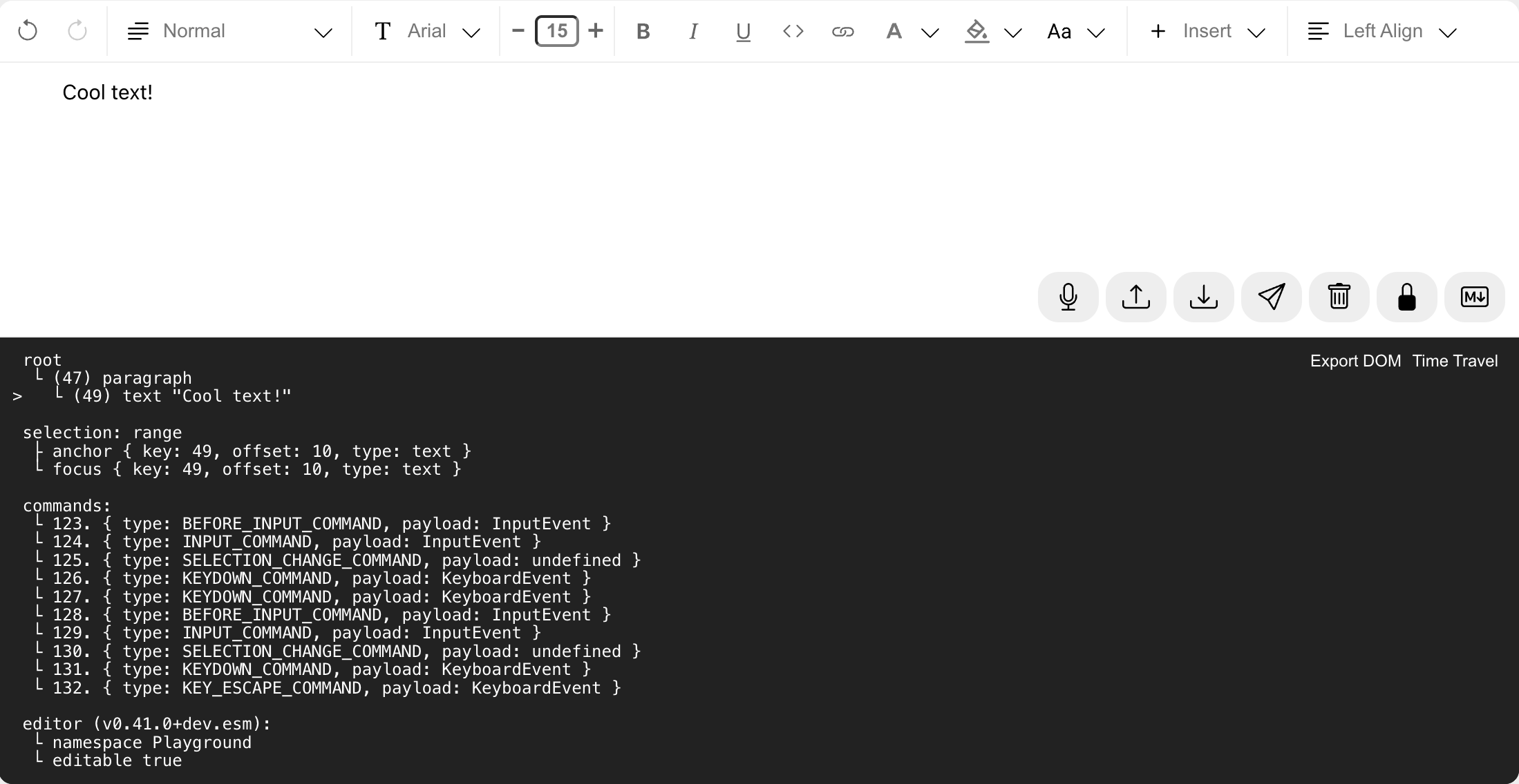 Lexical is minimal. It doesn't directly concern itself with UI components, toolbars or rich-text features and markdown. The logic for these features can be included via a plugin interface.
